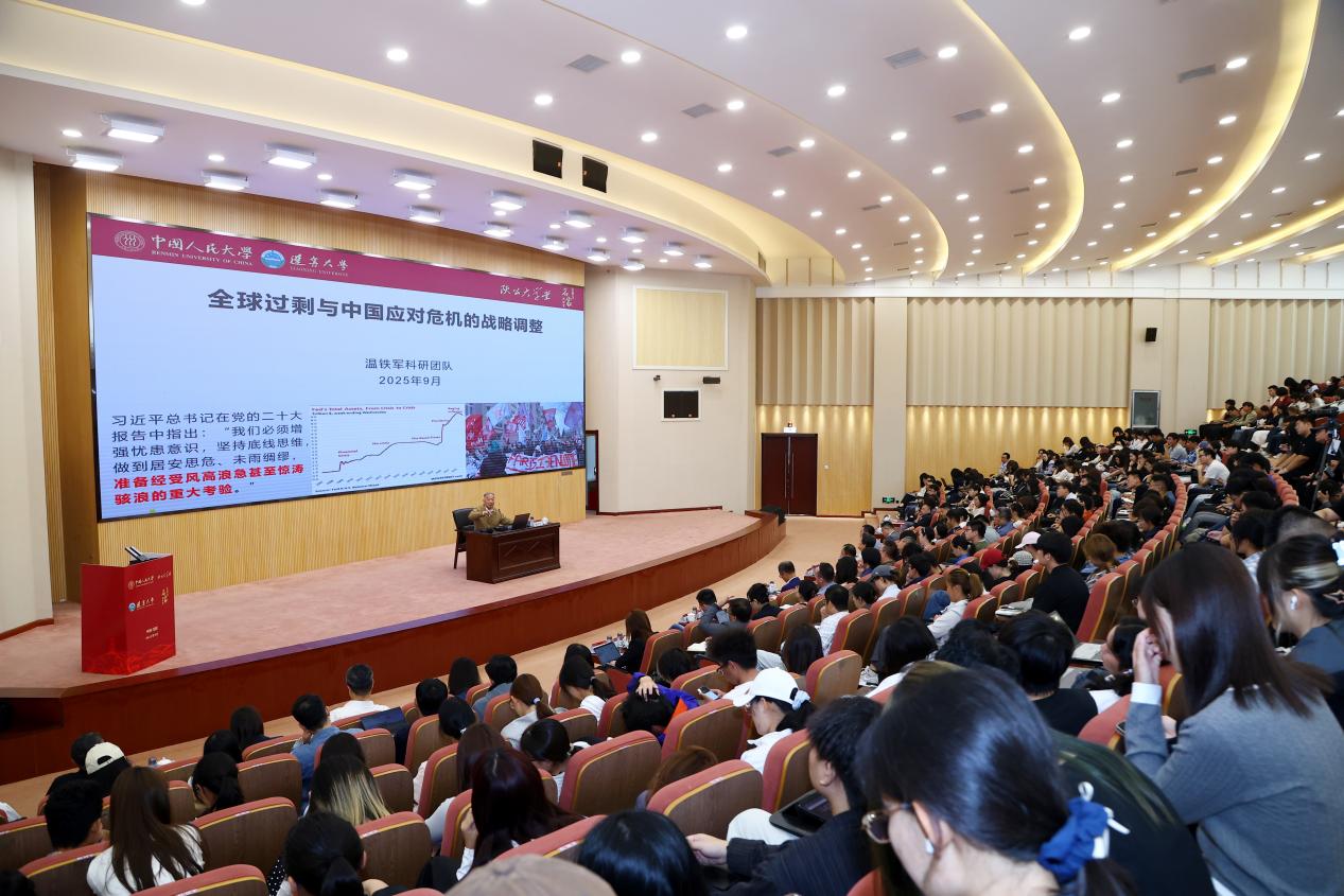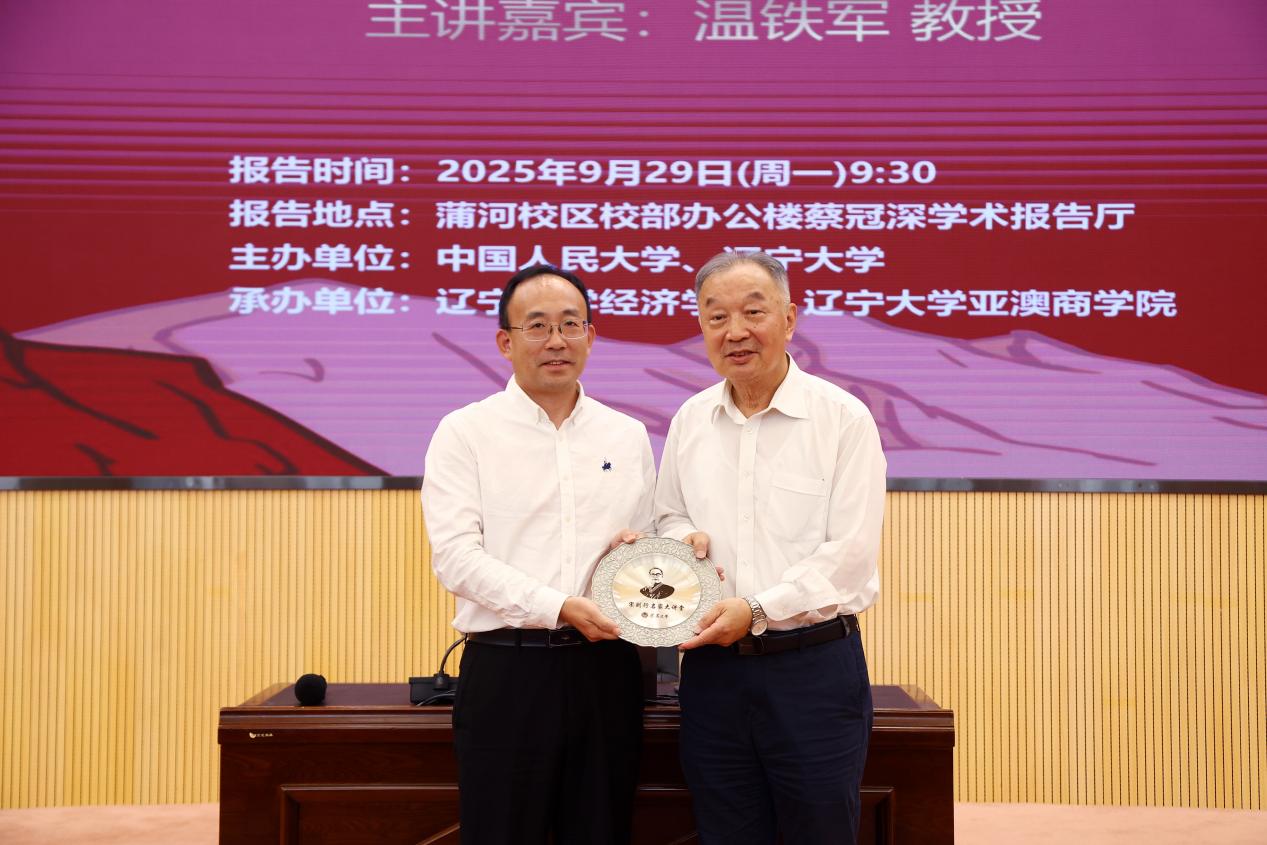 9月29日上午,“陕公大学堂”系列公益讲座(2025年第3期 )暨“宋则行名家大讲堂”(第二十九讲)在辽宁大学蔡冠深学术报告厅隆重举行。福建农林大学乡村振兴学院院长、西南大学中国乡村建设学院执行院长、中国人民大学农业与农村发展学院原院长温铁军教授应邀作了题为《全球过剩与中国应对危机的战略调整》的学术报告。第十四届全国人大代表,国际经济学会会士,辽宁大学党委副书记、校长余淼杰教授在线上致欢迎辞。辽宁大学党委常委、副校长仇焕广教授,中国人民大学校友服务与资源拓展部负责人和校友代表,辽宁大学各单位负责人和师生代表,以及来自辽宁电视台、辽宁日报的记者参加报告会。报告由经济学部副主任王伟光教授主持。