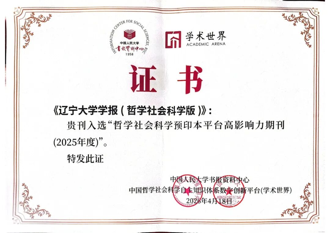 4月18日,在“2026年中国人民大学复印报刊资料转载指数发布暨‘人工智能+哲学社会科学研究’论坛”上,中国人民大学书报资料中心与中国哲学社会科学自主知识体系数字创新平台(学术世界)联合发布《哲学社会科学预印本平台高影响力论文、期刊评价研究报告(2025年度)》。在该报告评选中,《辽宁大学学报(哲社版)》成功入选2025年度高影响力期刊。